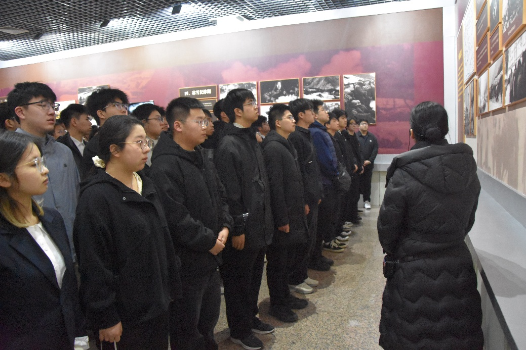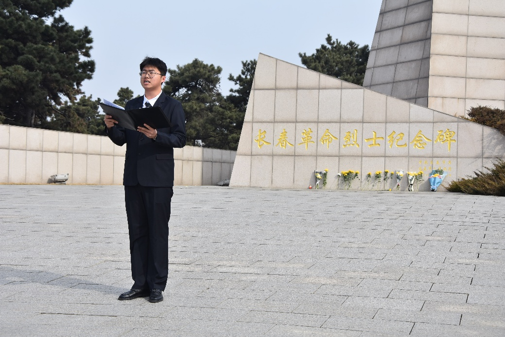 上午十点,2024级员工代表罗子尧同学在纪念碑下进行了“雨落英雄冢,山河铸忠魂”主题演讲,追思英烈精神。之后,同学们在长春市革命烈士纪念碑前默哀一分钟,并献花以寄哀思。随后,同学们进入长春市烈士纪念馆,历史的厚重感扑面而来。当讲解员轻声念出百年前"山河破碎风飘絮"的诗句时,当同学们看到生死存亡的抉择被摆在英烈面前时,展柜中散发着永恒光辉的革命文物早已讲出他们的答案。历史长河奔涌向前,那些定格在十八岁的年轻生命,终究化作永不熄灭的星辰,为后来者照亮前行之路。