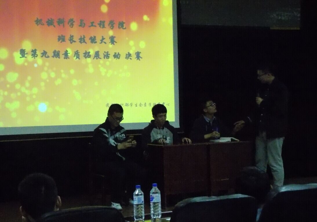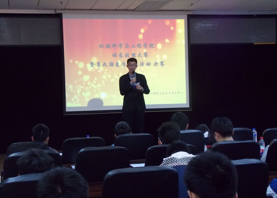 为提高yl23455永利2014级各班班长的综合素质,锻炼各班班长的表达能力、社交能力、实践能力,培养各班班长协调和处理人际关系的艺术与技巧,使其能充分展示自己的风采面貌,成为一名经得起考验的合格班长,yl23455永利团委组织部、员工会素质拓展中心于24日晚在机械材料馆8楼学术报告厅联合举办了此次“班长技能大赛”决赛。yl23455永利团委负责人夏禹老师、主席团部分成员、2014级全体班长参加了本次比赛。