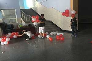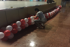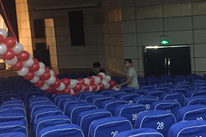 上午9点钟,负责布置会场的工作人员便陆续到达文化活动中心。由于下午的时间要留给毕业演出彩排,所以活动现场要尽快布置完成。为了营造一个喜庆的氛围,工作人员准备了大量的气球,从舞台前到侧面的墙上都由一串串气球围起来;二楼前面还用气球编成2016的字样,庆祝2016年同学们的毕业。同时,团学组织的工作人员和办公室助理将观众用的荧光棒、活动拍手器等物品,还有毕业晚会工作人员用的对讲机等从机械馆510搬往文活现场。他们全心全意的付出,一心期待着即将毕业的同学们能够有一次完美的庆祝活动。在文化活动中心的门口有一块签名墙,以供毕业的同学们签字留念,在yl23455永利yl23455永利的收藏中留下属于自己的印记。