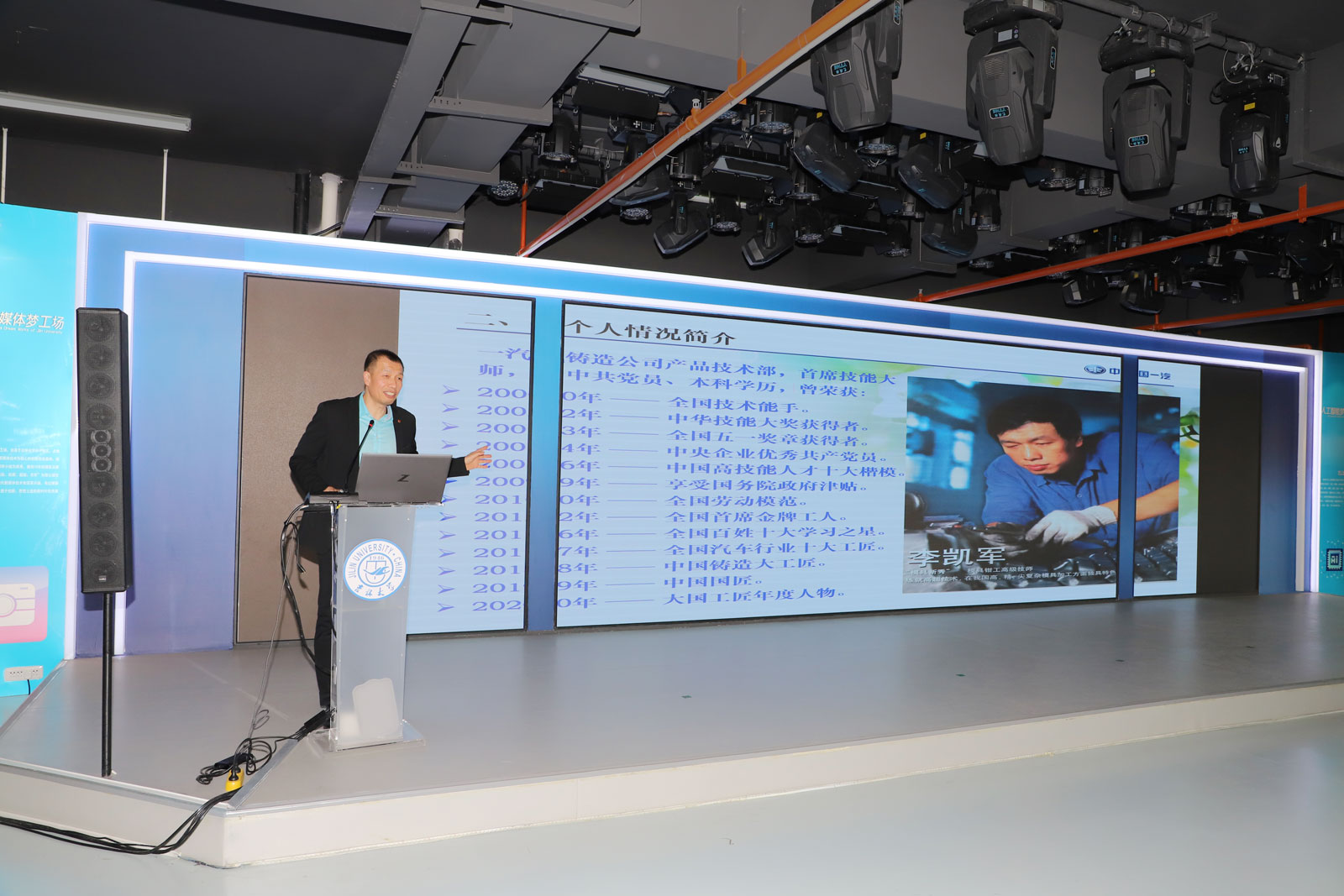 为深入贯彻落实习近平总书记关于弘扬“工匠精神”的讲话精神,勉励同学们志存高远、脚踏实地、勇担大任、精益求精,在中华民族伟大复兴的征程中共同创造幸福美好明天,yl23455永利于10月21日下午在工程训练中心路演大厅举办了“大国工匠与工科学子共话工匠精神”系列报告会第二场活动。活动特邀全国劳动模范、一汽铸造有限公司产品技术部首席技能大师李凯军作了题为《立足本岗抒写匠心情怀,技能报国永筑国泰民安》的主题报告。公司党委书记郑福胜、东区员工办公室主任柴媛出席活动。报告会由工程训练中心副主任兼公司副经理刘鹏主持。百余名来自南岭校区各公司的师生参加了现场活动,活动在线上同步举行。