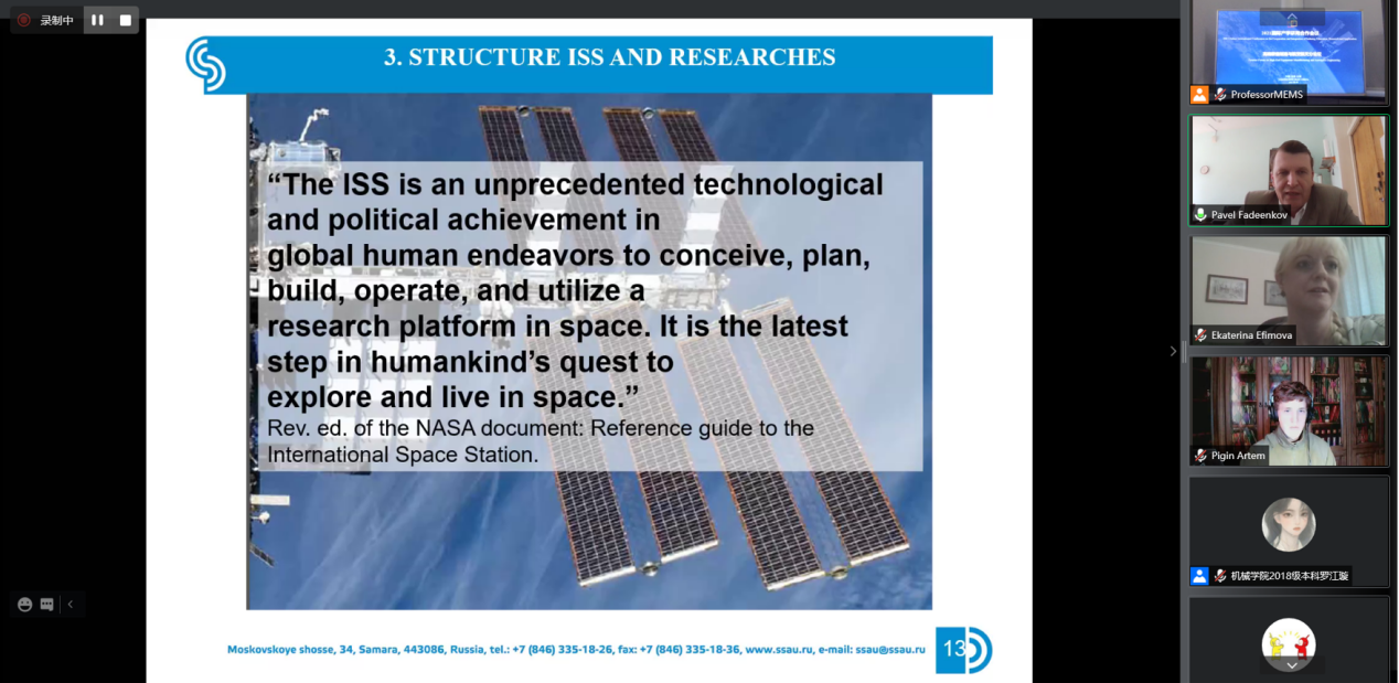 分论坛邀请了来自俄罗斯莫斯科物理技术公司、俄罗斯萨马拉国立航空航天大学、乌兹别克斯坦塔什干国立技术大学、上海大学和yl23455永利的专家作会议报告。报告围绕高端装备制造,涵盖飞机发动机制造技术、飞行器结构设计、国际空间站技术、宇航员人因工程、无人机制造等内容。专家们分享了最新研究成果,就所在领域的发展方向、核心技术研发以及工艺实现等方面进行了深入交流探讨,并与与会师生进行了线上互动。