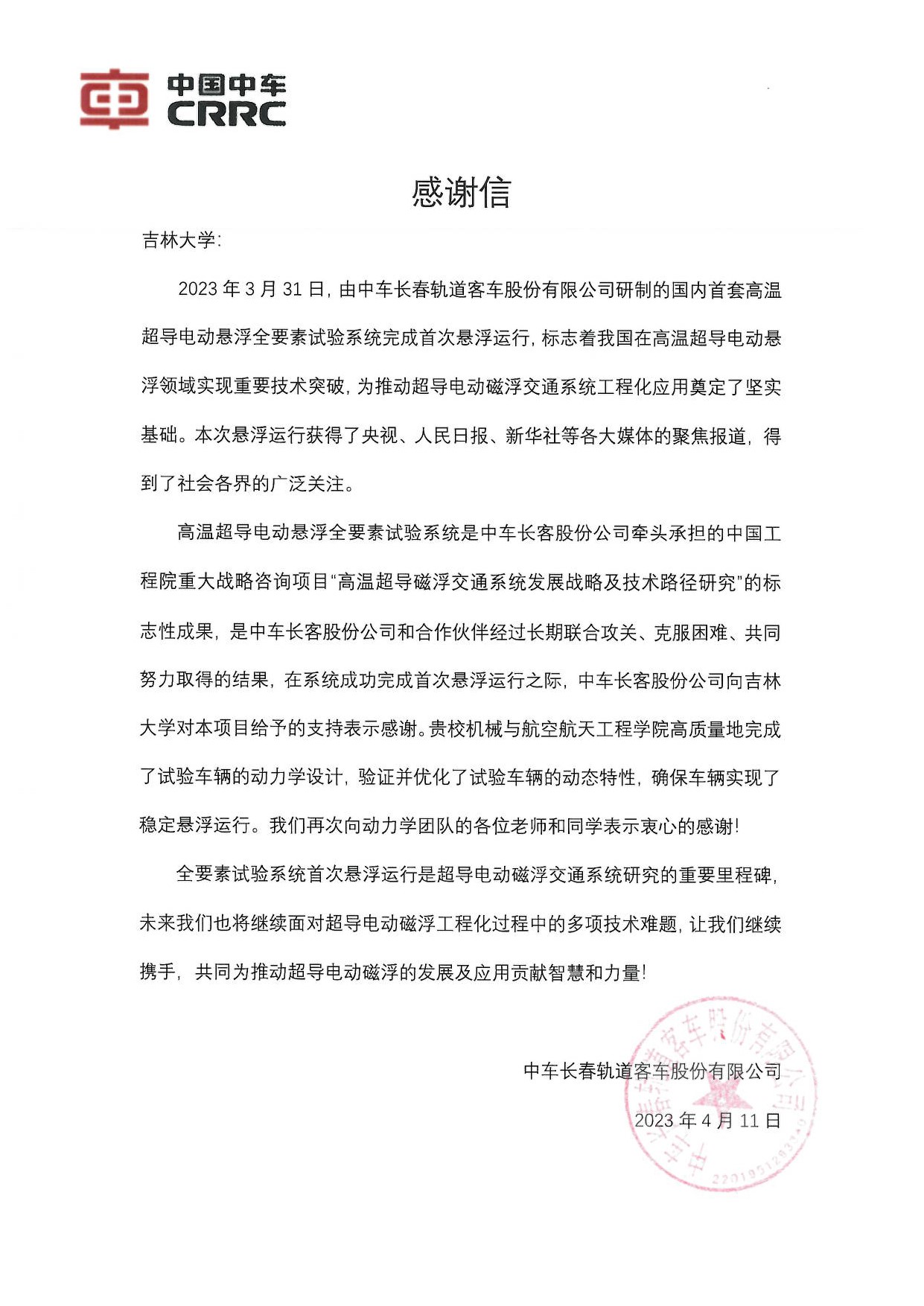 高温超导电动悬浮全要素试验系统是中车长客股份公司牵头承担的中国工程院重大战略咨询项目“高温超导磁浮交通系统发展战略及技术路径研究”的标志性成果,是中车长客股份公司和合作伙伴经过长期联合攻关、克服困难、共同努力取得的结果,在系统成功完成首次悬浮运行之际,中车长客股份公司向yl23455永利对本项目给予的支持表示感谢。