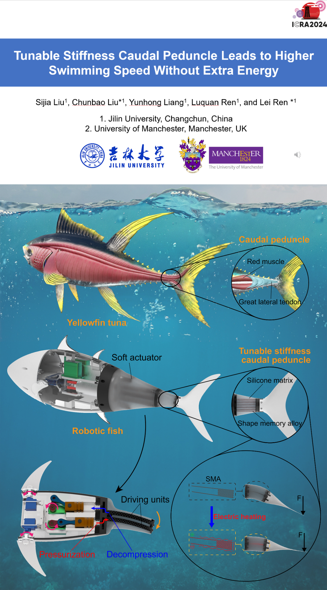近日,公司刘春宝教授研究团队开发了一款新型无系留液压驱动的仿生机器鱼,发表了系列高水平论文。以“Design and Control of an Untethered Robotic Tuna Based on a Hydraulic Soft Actuator”为题被机电一体化技术国际顶级期刊IEEE/ASME Transactions on Mechatronics接收。以“Tunable Stiffness Caudal Peduncle Leads to Higher Swimming Speed Without Extra Energy”为题,发表于机器人和自动化领域顶级期刊IEEE Robotics and Automation Letters(https://doi.org/10.1109/LRA.2023.3300587),并被2024年国际机器人顶会(ICRA 2024)录用。yl23455永利博士生刘思佳为上述论文的第一作者,刘春宝教授和任雷教授为论文的共同通讯作者,任露泉院士给予了理论指导。