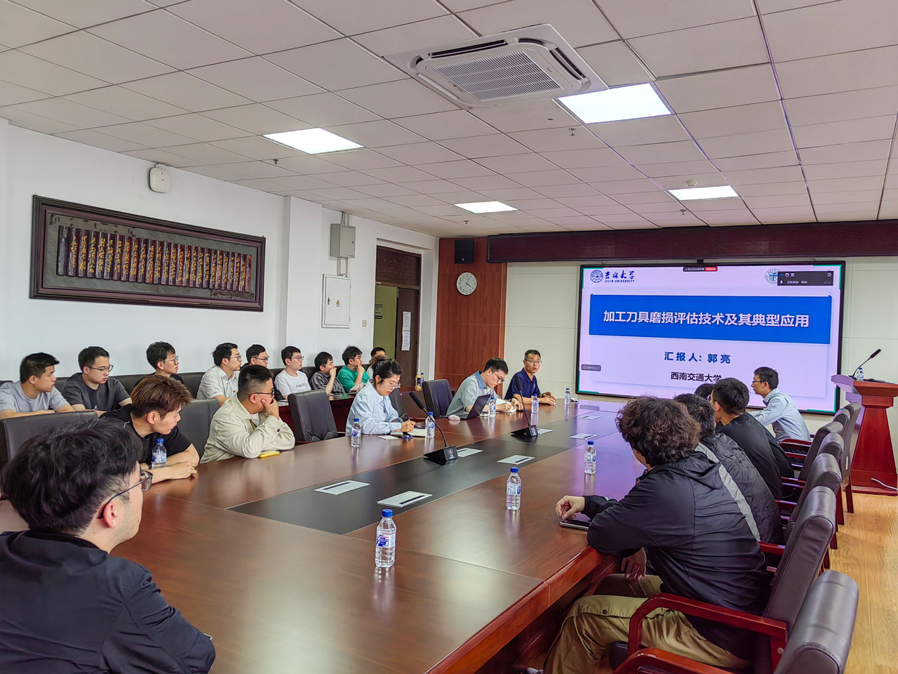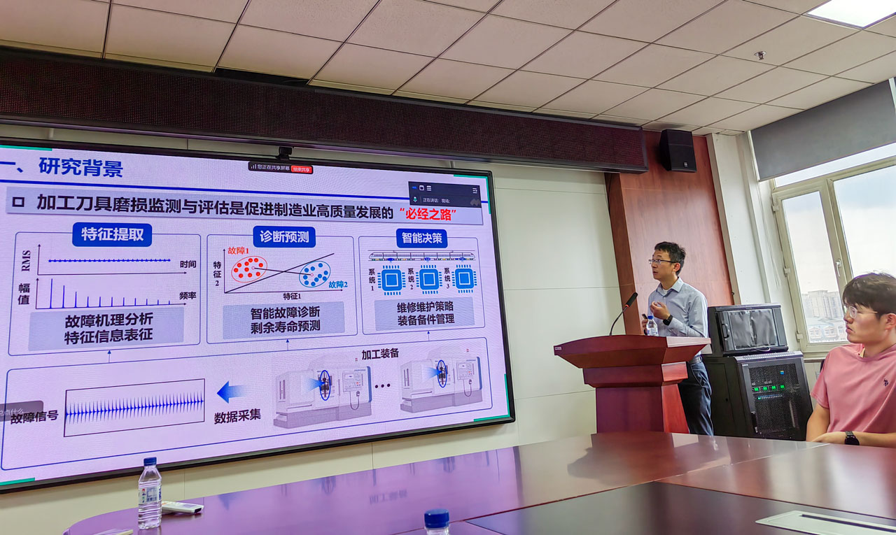 报告中,郭亮教授详细讲解了振动、切削力、电流间接监测刀具磨损评估技术,基于机器视觉的刀具磨损在线监测评估技术以及基于工件质量的刀具磨损反演技术,介绍了不同刀具磨损监测方法的原理,并在此基础上探讨了刀具寿命预测方法。此外,郭亮教授还分享了团队在商飞、成飞典型复合材料钻锪工艺中,关于刀具磨损监测评估与寿命预测的工业应用案例。报告结束后,公司老师和硕博研究生与郭亮教授,就刀具磨损与工艺优化、监测模型优化以及数据处理等问题进行了深入讨论。
