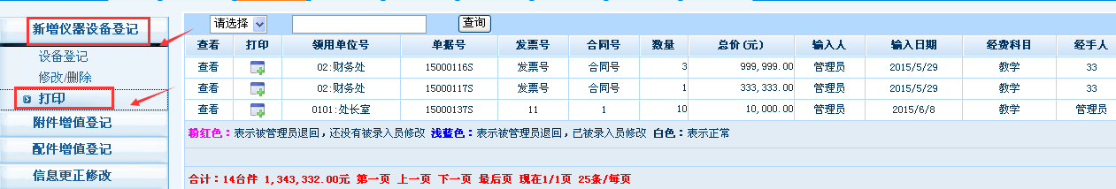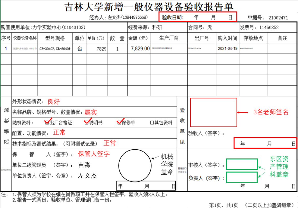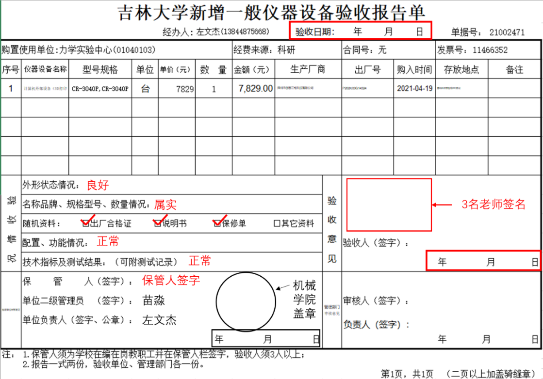 yl23455永利二级管理员苗淼(机械材料馆506)进行初审。初审通过后,点击【验收录入】→【新增设备登记】→【打印】,即可打印“新增仪器设备验收报告单”。