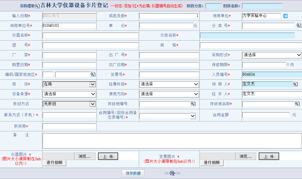 进入【设备仪器登记】界面,填写相关信息(*为必填项)。填写完成后,点击【保存数据】提交信息。