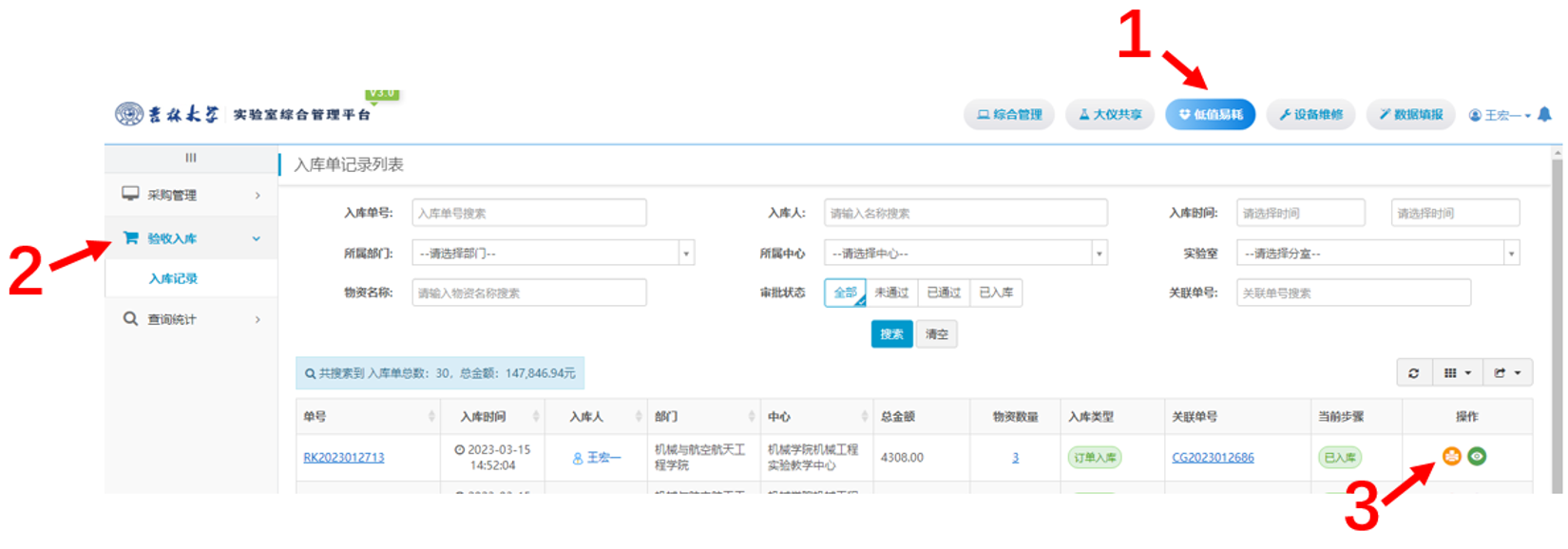 验收人审批均完成后,如下图依次点击,在入库记录中选择对应入库单打印:(1)低值易耗 (2)验收入库 (3)打印图标。在此界面也可查看审批进度,部分入库单最后需要公司徐媛媛老师入库审批,一般徐老师工作日每天都会审批,无需特意联系。