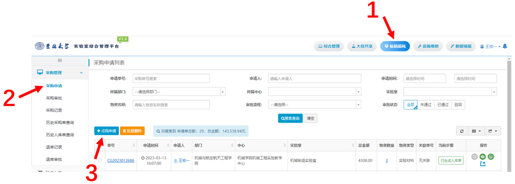 依次点击,进入材料申请界面:(1)低值易耗(2)采购申请(3)点我申请。
