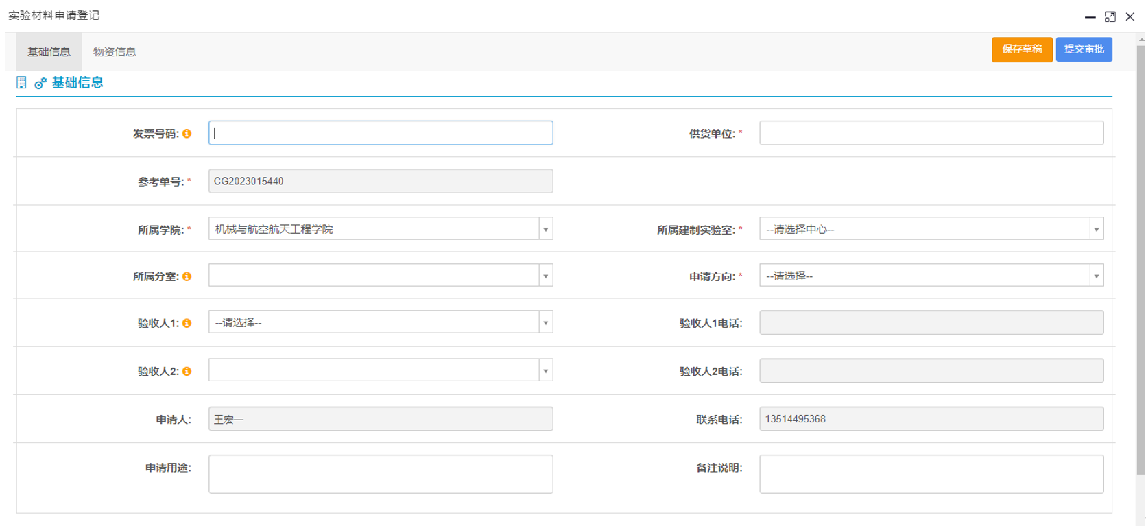 (2)根据使用物资的实验室,选择所属建制实验室和所属分室。并选择申请方向(教学或者科研)。